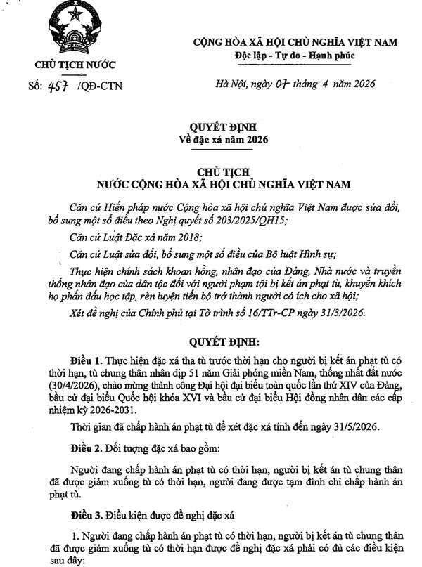 Dưới đây là hình ảnh Quyết định số 457/QĐ-CTN của Chủ tịch nước về đặc xá năm 2026.